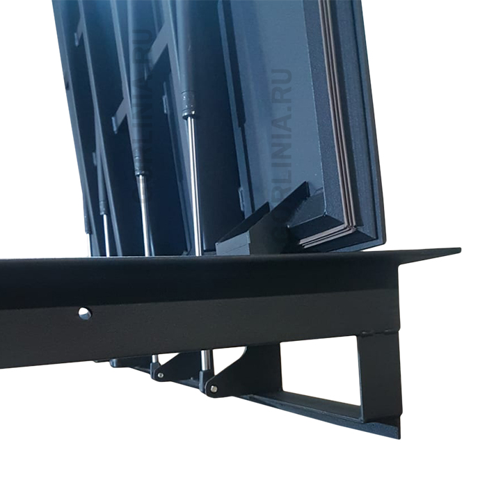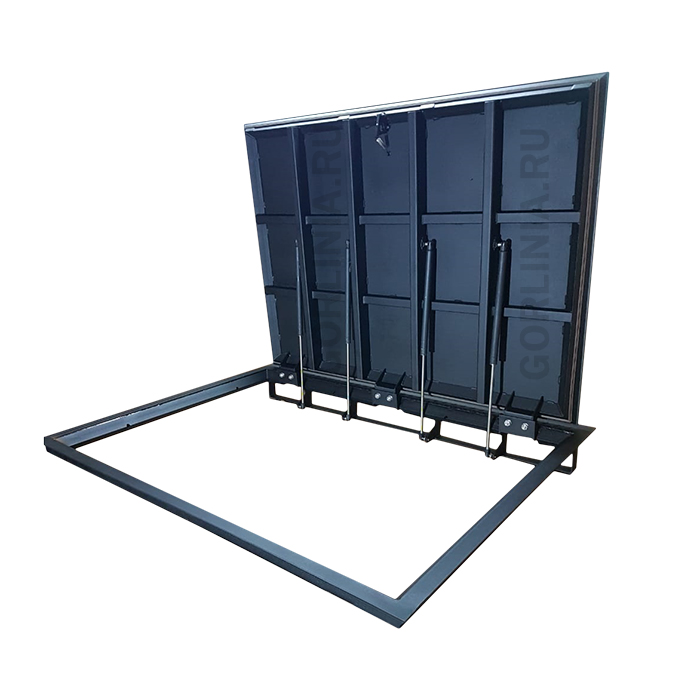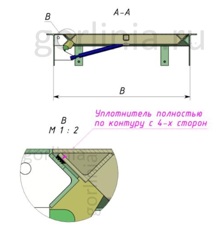 Объемное соединения марок уголков 63х40, 40х40 в раме многократно увеличивает несущую способность крышки в гараже (принцип элерона крыла самолета). Дверца в обвязке из уголка 40х40, профиля 50х25, 30х30 обшита металлическим листом «чичевица» толщиной 3 мм, окрашена порошковой эмалью.