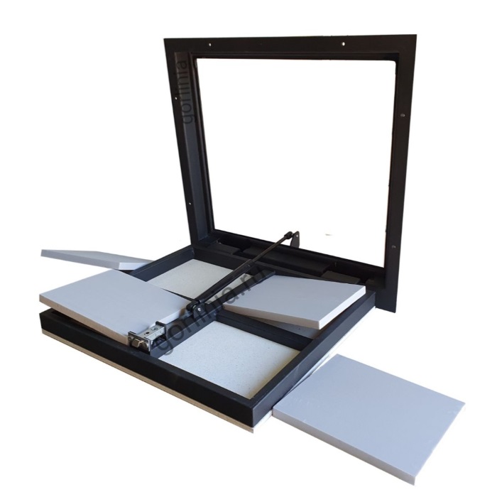 Каркас полотна сварен из трубы 30х20 в комбинированных положениях с заполнением ГВЛ в уровень коробки под облицовку плиткой по принципу невидимки с сохранением рисунка и швов раскладки керамогранита в комнате. Для открывания лаза в погреб 1150х700 используется съемная ручка.