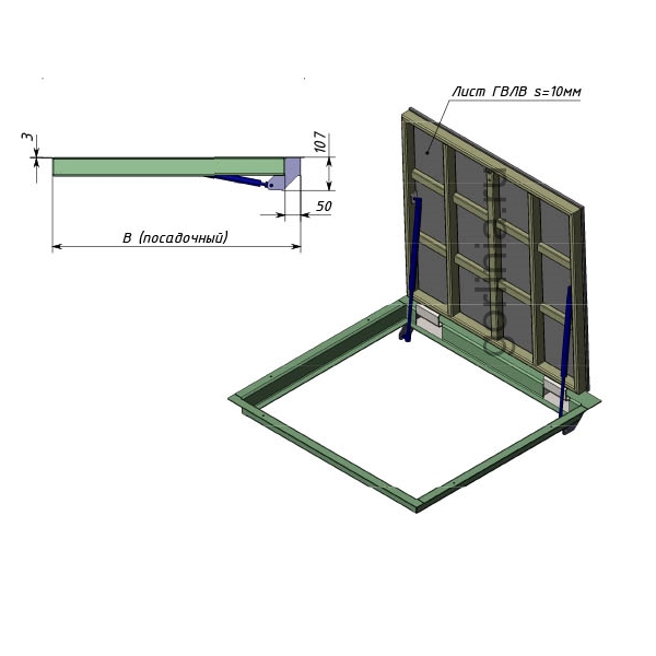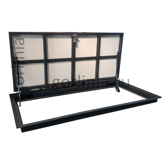 Нестандартная прямоугольная форма с шарнирным механизмом по длинной стороне, зауженным лазом в подполье 750*500.